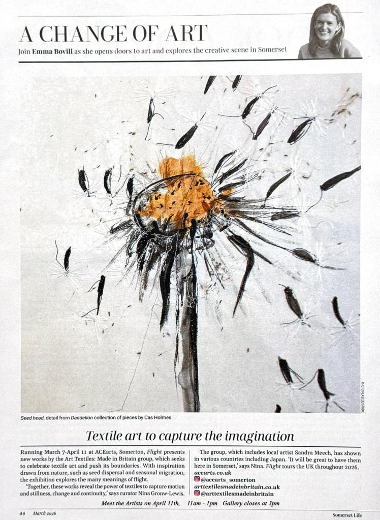 ‘Time Flies’ (featured below in Somerset Life Magazine) is on exhibition with Art Textiles Made in Britain which continues its exhibition tour starting at ACE Arts in Somerton March 7-April 11 , and Mandell’s Gallery. Norwich April 25-May 23. before finishing at Queen Street Gallery Neath 5-25th September.